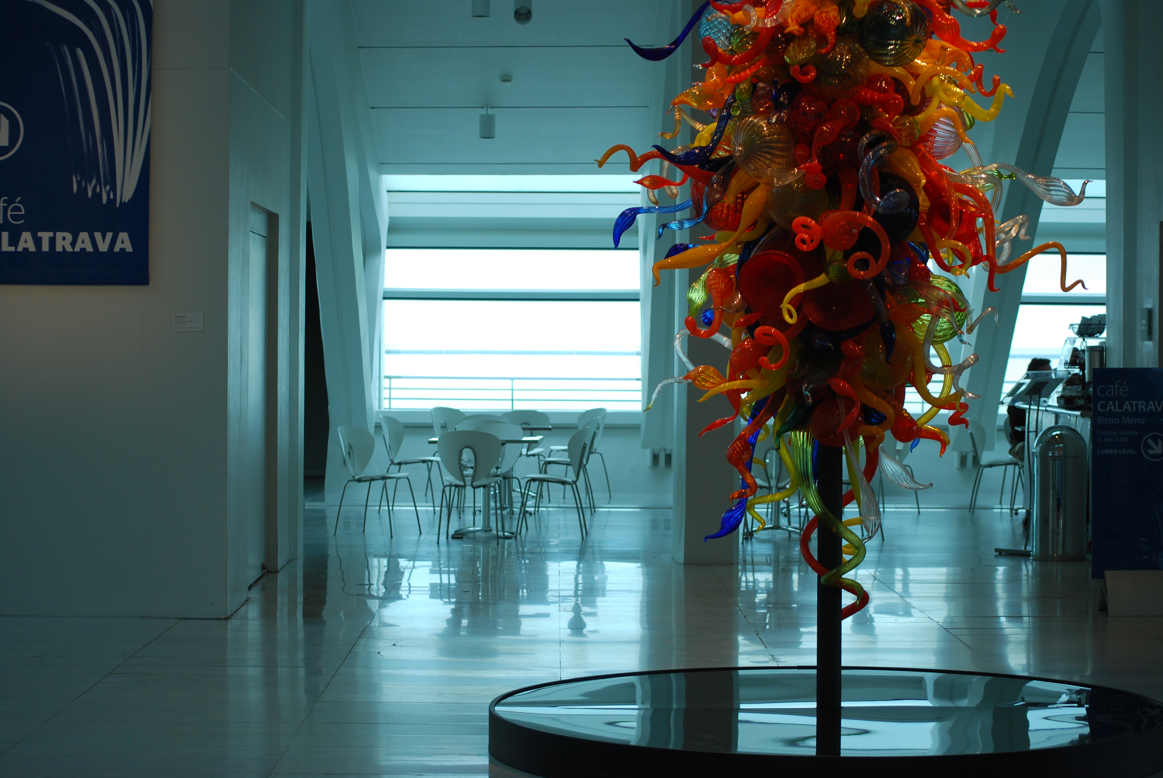 I took a photo of the Harbor House – tres chic restaurant, and then headed over to my office. The Coffee with a Conscious café is just off of the hall, so from my desk, I could see the hall, out the windows next to me, or I could look at the Chihuly sculpture, which is one of my favorite pieces in the museum.