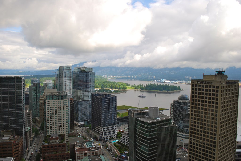 View from The LookoutI quickly discovered that Vancouver is probably one of the most wonderful cities in North America. Great weather… it was in the upper 60’s the whole week I was there, in late June. A little rain early in the morning, and then sun. Public transport was so easy to navigate and I could get wherever I wanted to go. Food was fabulous. You can choose from any ethnic menu imaginable, or go for an organic salad at the little corner bistro. If you like good coffee, which is one of my favorite things, I found this was a great city to sit in a café and watch the world walk by.